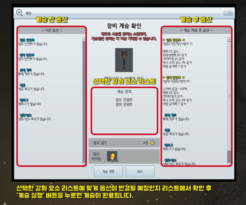 선택한 강화 요소에 맞게 계승이 진행될 예정인지 미리 확인할 수 있습니다.