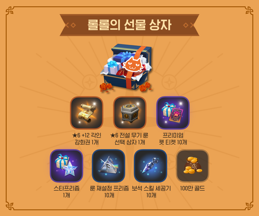 | 롤롤의 선물 상자 | ★6 +12 각인 강화권 * ★6 이하의 룬이 각인된 장비에 사용 시, 각인 강화 수치를 +12로 변경 가능 |