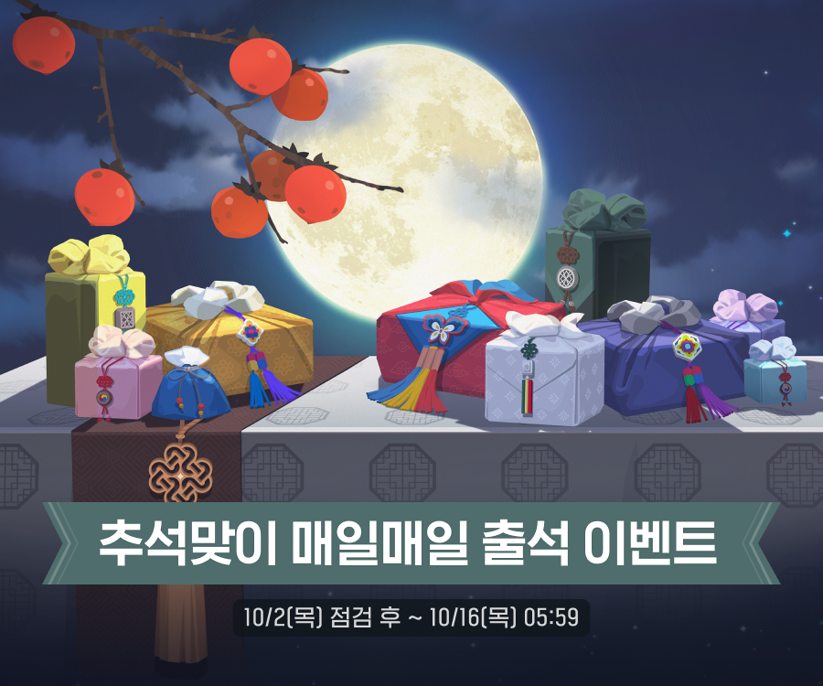 - 이벤트 기간 동안 우측 상단 [메뉴(≡)] → [이벤트] → [추석맞이 매일매일 출석! 이벤트] 탭에서 미션 진행 완료에 따라 선물을 받으실 수 있습니다.